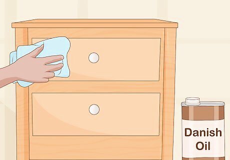 Cover your dresser with Danish oil for additional protection. Purchase a can of Danish oil finish like Watco and brush a liberal amount of it onto your dresser. Give the oil about 15 minutes to soak in, then add a second coat on top. After 15 more minutes, wipe off the surface of your dresser with a sponge. Repeat this process once a day until you're satisfied with the dresser's finish. Though Danish oil doesn't emphasize the wood quite as much as standard oil, it provides far greater protection from heat, stains, scratches, and chemicals. Look for Danish oil finishes at home improvement stores.
