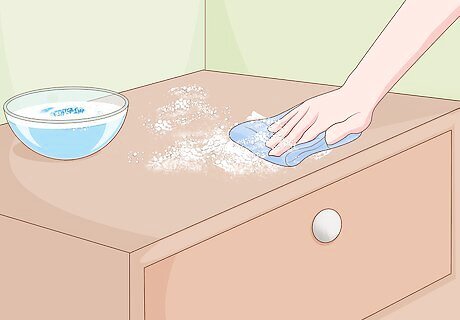 Wash off dirt and grime using soap and water. Grab a standard kitchen sponge and soak it in a mixture of liquid dish soap and water. Then, scrub your dresser thoroughly to remove any built up gunk. When finished, rinse the wood using a sponge soaked in fresh water and dry the dresser off with a clean towel. To avoid damaging the wood, make sure to use gentle scrubbing motions. For moldings, carvings, and hard to reach nooks and crannies, use a paintbrush instead of a sponge.
