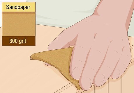 Switch to a less coarse sandpaper once you see the original wood. After sanding your dresser down for a while, you'll start to see small bits of the original dresser wood poke through the remaining paint and stain. When this happens, switch to a 300-grit sandpaper to avoid damaging the dresser. If you're using a power sander, switch to a handheld sanding method at this time.