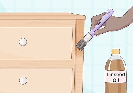 Refinish your dresser with oil to bring focus to its grain and texture. Buy a container of linseed oil or a similar finishing oil. Using a wide paint brush, cover your dresser with the oil, making sure to get every visible nook and cranny. Let the oil soak in for 10 minutes, then wipe off the excess with a towel and add on another layer. Repeat the process until you've added 5 to 6 total layers. You can find oil finish at most home improvement stores. Oil finish creates a glossy sheen that emphasizes the wood's natural look. When cleaning your refinished dresser, rub a few drops of oil into it to buff the surface. For the best results, make sure to rub with the grain.