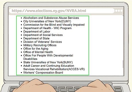 Find a local Agency-based registration center if the DMV is far away. While most people register at their local DMV or county board of elections location, New York allows numerous state offices to receive and process voter registrations. Submitting your paperwork to any Agency-based registration center will also successfully register you to vote. For a list of Agency-based registration centers, visit https://www.elections.ny.gov/NVRA.html. Some Agency-based registration centers include the Department of Health, Department of Labor, City University of New York, State University of New York, Office of Mental Health, Office for People With Developmental Disabilities, and many others. You can submit your paperwork at any of these locations.