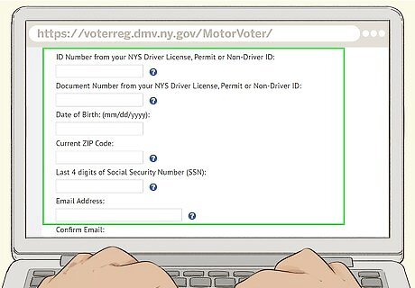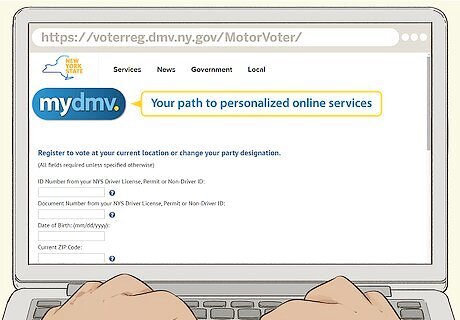 Visit the Voter Registration page on the Department of Motor Vehicles website. Follow the necessary links and instructions that you find on this page. To register, visit https://voterreg.dmv.ny.gov/MotorVoter/. If you have trouble finding this page on the DMV website or the link changes, you can also try an internet search for “New York DMV voter registration page.”