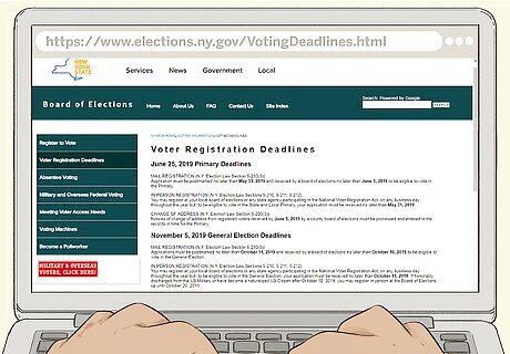 Meet the qualifications for voter registration. Not everyone can vote in New York. There is a set of criteria you have to satisfy before you can register, such as being a full US citizen and being 18 years old by December 31 of the year in which you register. Other requirements: Be a resident of New York State for at least 30 days before the election. Must not be in prison or on parole for a felony conviction. Not be judged mentally incompetent by a court. Must not claim the right to vote anywhere else.