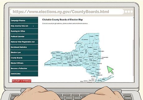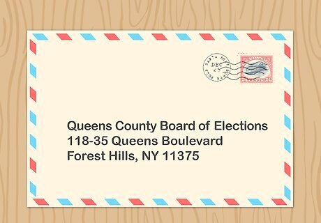 Find the address for your county board of elections. On the bottom of the voter registration form, there is a list of all the board of elections offices in New York State. Each county has its own office, and you’ll have to mail the form to the office in the county you live in. Find your county on this list and address an envelope to the location given. For example, if you live in Greene County, you have to address your registration form to the Greene County Board of Elections. If you can’t find the address for your county office on the registration form, you can also find a list of county office addresses at https://www.elections.ny.gov/CountyBoards.html. You can also do an internet search for your county name and the board of elections address.