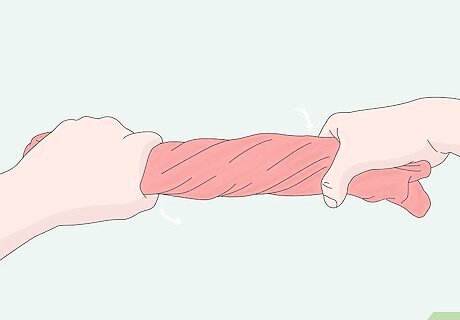 Do a towel stretch by twisting a towel in opposite directions. Hold the ends of a towel in each of your hands. Next, twist the ends of the towel in opposite directions like you are wringing water out of the towel. Hold the stretch for 1-2 seconds, then release the towel to complete 1 stretch. Twist with both hands at the same time. Do 10 stretches in the same direction, then reverse directions and do 10 more.