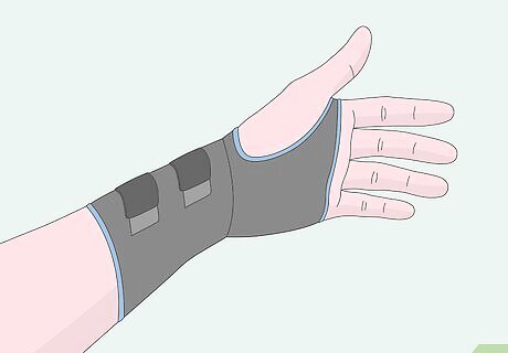 Place a splint on your hand to help keep your hand from moving. This can ease pain caused by a hand injury or carpal tunnel. Many times, purchasing a hand splint or brace that fits your hand size is a good way to reduce pain as it keeps your hand from moving around. Wear the splint whenever you feel pain, or whenever you do an activity that has caused your hand pain previously. Wearing a splint overnight can prevent your pain from worsening. Expect to wear your splint for at least 4-8 weeks before you'll notice improvement. Avoid wearing a hand splint or brace all the time, as this can make your muscles weaker by not being used as often. Using a splint can also help wrist pain that's caused by radiating pain from tennis or golfer's elbow. Visit your local drugstore or big box store to find a hand splint in the right size, or ask your doctor to give you one.