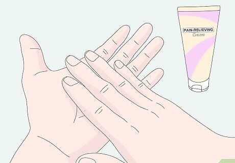 Rub a hand cream on your hands that targets pain. There are specific creams on the market that you can apply to your skin to help soothe pain in your hands related to carpal tunnel, arthritis, and many other conditions. Look for a pain-relieving cream and rub it onto the area that’s hurting, following the instructions that come on the packaging. For example, you might use Bengay pain relieving cream or Aspercreme, which have an active ingredient of methyl salicylate to relieve pain. You can find pain-relieving hand creams in big box stores, drugstores, and online.