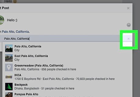 Remove the location. This step will vary depending on whether you're removing the location from a post or a photo: Post - Click Edit in the drop-down menu, then click the X to the right of the location and click Done. You may first need to click the location's name and then click x to the right of the location. Photo - Click the large X to the right of the location's name in the upper-right side of the page, then click Done Editing.