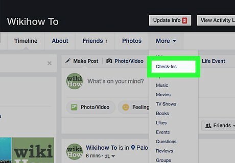 Open the Check-Ins page. Select More near the top of your profile page, then click Check-Ins in the resulting drop-down menu. Doing so opens a page with a list of all of your check-ins. If you don't see Check-Ins in the More menu, do the following: select More > click Manage Sections > check the "Check-Ins" box > click Save > select More and click Check-Ins.