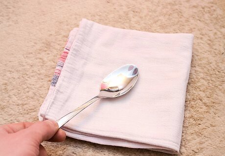 Massage the cloth with a spoon. Use the bottom of a spoon to gently press down on the cloth. Gradually work your way all over the cloth, starting on the outside and working your way toward the center in a spiral to prevent spreading the stain. This process works the solution into the carpet without rubbing the stain in or damaging the carpet fibers.