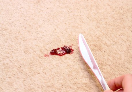 Scrape up excess jelly with a butter knife. Gently scrape away the excess jelly as soon as possible after the stain sets. Use the dull edge of the knife, and remove as much of the jam as possible.