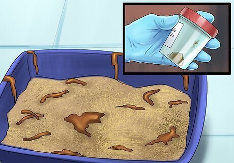 Take fresh stool from your cat's litter box. The best sample for parasite testing for a cat is a stool sample, preferably from that day. If possible, take fresh stool from your cat's litter box on the day you are going to the vet. Wear gloves when you handle the stool and place it in a plastic bag with a seal. If there is litter in the stool, that's okay. Try to get a sample that has as little litter on it as possible. Seal the stool sample in a plastic bag and carry it with you to the vet. Try to get the sample to the vet as soon as possible, as it is best to test it fresh. If you have multiple cats, take a stool sample for each cat. Write your cat's names on the bags their stool samples are in so you don't get them mixed up.
