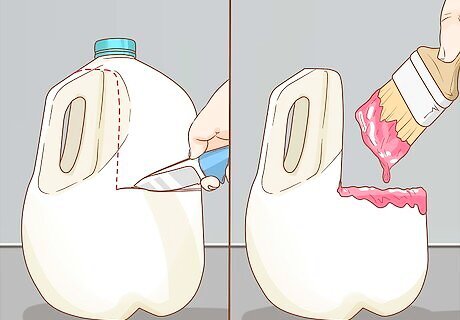 Use plastic bottles to make painting easier. You can use any plastic bottle with a handle—such as a milk carton or plastic coffee can—to hold paint. Whether you’re priming a fresh canvas or touching up the trim in a freshly painted room, repurposing a bottle as a paint tray or easel is easy enough. If the bottle’s opening is too small to dip your brush into, simply cut an opening of 6 to 8 in (15 to 20 cm) in to the side of the bottle on the opposite side of the handle and make one. Many people prefer using a bottle like this to a purchasable paint tray because the sharp edge left by your cut makes it easy to get excess paint off of your brush. To remove excess paint with the edge, simply press your bristles in to the edge while pulling your brush out and you’ll see the excess paint drip nicely back into the rest of the paint in the bottle.