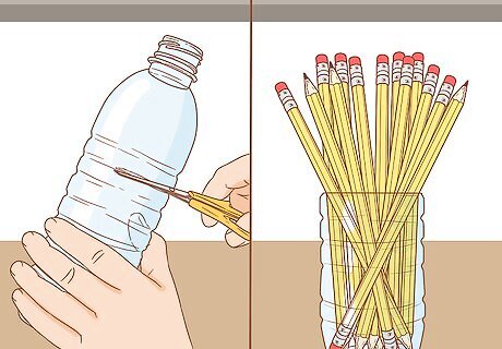 Cut plastic bottles in half to simplify desk storage. You can make a pencil and pen organizer for your desk with very little effort. First, use a knife to cut the plastic bottle to your desired length by cutting it in half. Then, use a pair of scissors to trim any sharp or rough edges. Lastly, you can use a steam iron to heat the edges a little bit and smooth them out, although sandpaper also works. You can paint or decorate the bottle to give it a personal touch! Be careful when heating the edges of a bottle with a steam iron. Use the lowest possible setting or you’ll warp the plastic. Half the height of a standard 16 oz. water bottle works well for pen and pencil storage, but you’ll want to cut higher for longer materials like paintbrushes, or pipe cleaners.