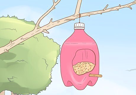 Hang a modified plastic bottle with strings to make a birdfeeder. Cut a rectangle in the center of your plastic bottle and fill it with bird feed. Wrap string around the lip of the bottleneck underneath the threads where the bottlecap rests, and hang it from a nearby branch to attract birds to your garden. You can decorate the bottle with acrylic paint to make it match the aesthetic of your garden. It is possible to make a landing for the birds to rest on by folding in smaller sections that you cut out and pushing them back into the bottle so that they sit perpendicular to the feeder. This is better if you want to attract smaller birds.