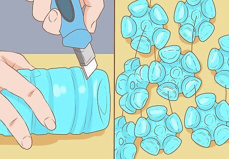 Make a chandelier using transparent plastic bottles. To make a plastic bottle chandelier, cut out the bottom portions of any transparent plastic bottles with groves in it. Clear soda bottles are perfect for this. Then, puncture each bottom portion with a thumbtack and string them together with fishing line. Once you have several lines of bottles strung together, you can tie them together and hang them over an enclosed light source to make a chandelier. Make sure that your light source is covered or you’ll risk melting your creation!