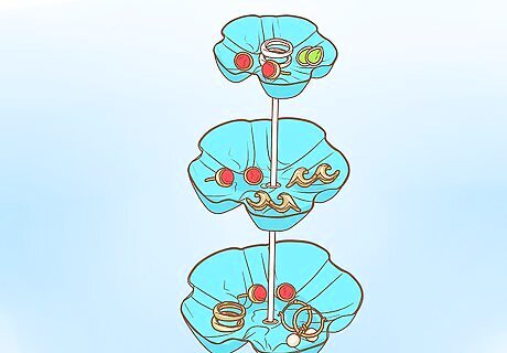 Build a vertical jewelry holder out of the bottoms of soda bottles. For this project, cut out the bottom portion of four plastic bottles, preferably of different sizes. Use a drill or knife to create an opening in the center of each plastic section. Take any length of metal rod and, starting with the biggest section of plastic, carefully insert each portion of bottle through the rod vertically to make a jewelry stand. You can use nuts and washers to keep each section firmly in place if the rod is threaded. You can mix colors if you’d like to make your jewelry holder match a color scheme.