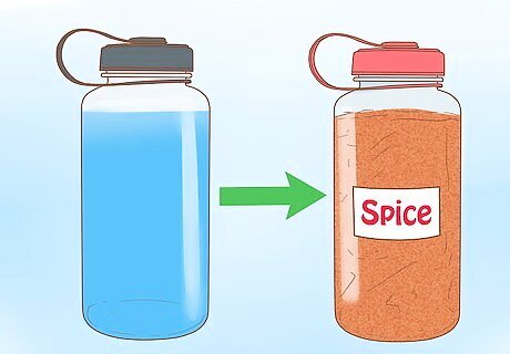 Store dried goods like spices or snacks in empty plastic bottles. One of the benefits of clear plastic bottles is that it is easy to identify what is inside. This makes clear plastic bottles excellent storage containers for dried goods, spices, or snacks—especially since you can usually seal them tightly to keep their contents safe during storage. Make sure that you don’t heat the bottle in the microwave or set it in hot water. Certain kinds of bottles have added benefits as well. In particular, coffee creamer bottles come with caps that make pouring quite easy. Make sure to check the number inside of the triangle at the bottom of plastic bottles before using them to store food. Any plastic bottle with a #2, #4, or #5 printed at the bottom of the bottle is safe for food storage, but bottles with a #4 may not hold up in the long term.