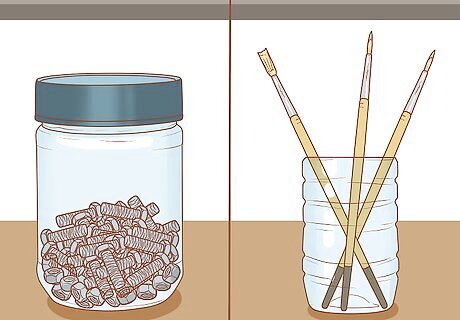 Stash smaller materials in larger plastic bottles for long-term storage. You can cut larger bottles in a variety of ways based on your storage needs, and some of them are even stackable. If you have a workshop filled with random bolts and screws, or an artist’s studio packed with paints and pastels, larger plastic bottles can be a simple solution for long-term storage needs. Make sure that you wash larger bottles carefully before stashing anything important inside of them.