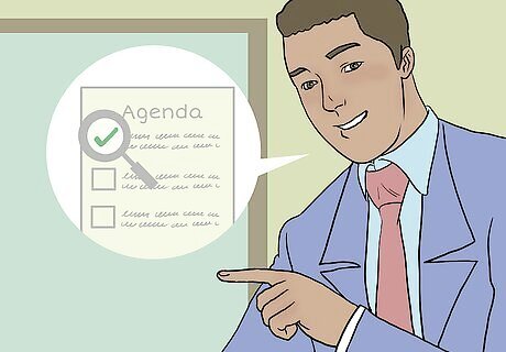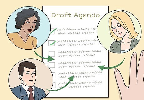 Write a draft agenda and circulate it around before the meeting. When you schedule a meeting, include a preliminary agenda that lists what the meeting will be about so people have a chance to prepare. Telling people what the meeting will be about ahead of time will make for a more effective and efficient meeting because everyone will be on the same page. If someone needs to put together information for the meeting, tell them how it relates to an item on the agenda. Send the draft agenda at least a week before the meeting.