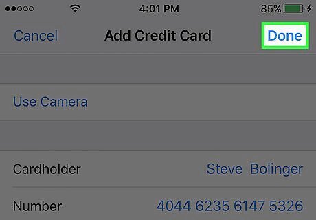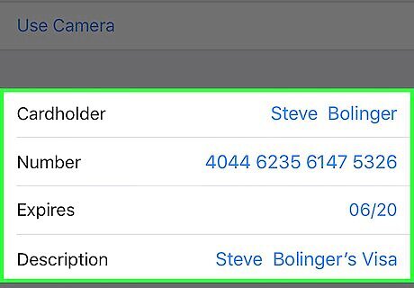 Enter your credit card information. Enter the cardholder name, card number, expiration date, and a nickname for the card. If you don’t want to type the card number, tap Use Camera, then position the front of your card in the rectangular frame.