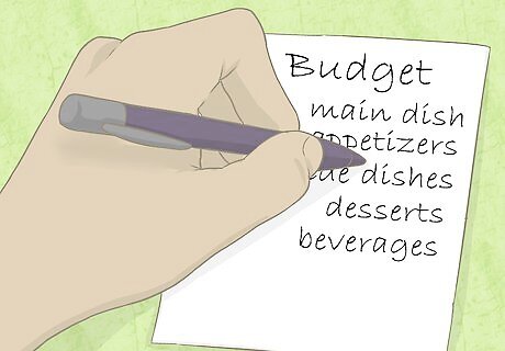 Make a budget for your Thanksgiving dinner. Look at your monthly budget and what’s in your bank account and decide how much you can afford to spend on Thanksgiving dinner. If you have any record of what you spent on the holiday last year, consider whether it is realistic to spend the same amount or if you will need to spend less. Considering your available budget for the occasion, determine how many people you can afford to invite and what recipes you can afford to make. Make a budget line for the main dish such as turkey or vegetarian options. Look at how much you spent on the main dish last year, and consider whether you need to spend less this year. Make a budget line for appetizers and side dishes. Make a budget line for desserts and beverages. Consider whether you have to invite fewer people this year or whether you might be able to organize the party in a different way. For example, you could save money by inviting fewer people, which would require less money spent on food, or you could save money by asking guests to bring some of the dishes or beverages.