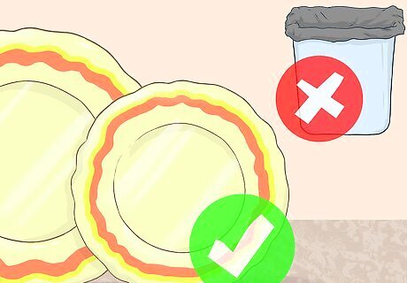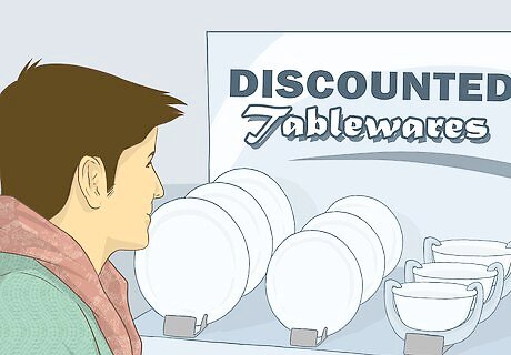 Shop around for tableware and place settings. Compare prices on tableware and settings at local department stores. You can often find good deals on tableware and settings at discount stores, department stores, and dollar stores. If you do not have money to spend on tableware or settings, you could also ask to borrow a few things from a friend or family member. Try using disposable plates. You can save money and avoid the dishes.