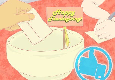 Make a wishing well centerpiece. Place a large bowl in the middle of your table. Before the meal or during appetizers, distribute small pieces of paper and some pens to guests. Ask guests to write a note about something they are thankful for in their life. Ask them if they are comfortable sharing their notes and, if so, to fold them and put them in the wishing well. During dessert, you can ask a volunteer to read a few of the notes aloud.