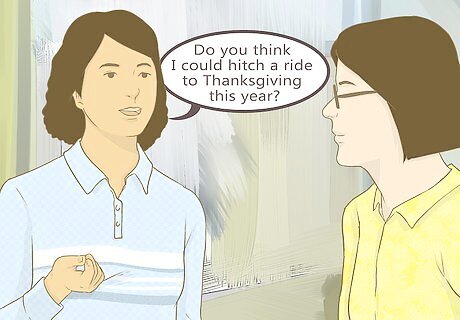 Get a ride. If you live in the same region or city as your family but do not own a car, you might want to look into getting a ride with friends or family members. By getting a ride, you will save the expense of a long bus or train trip. Ask your parents if they invited anyone else who lives in your neighborhood or city. You might ask, “Do you know if anyone else is coming from Rockport this year and if I could hitch a ride?” Ask a friend, “Do you think I could hitch a ride to Thanksgiving this year?”