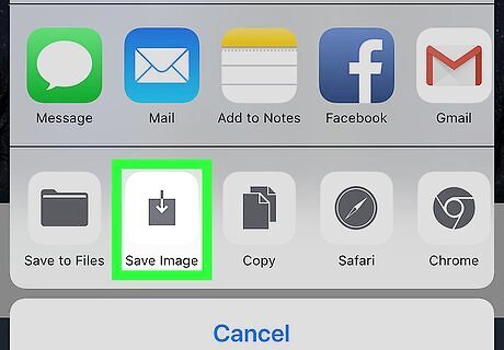 Tap the Save Image button on the pop-up menu. This option looks like a downward arrow in a gray box at the bottom of your screen. It will download and save the selected GIF to your Camera Roll.