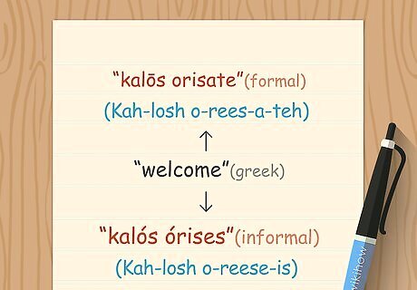Greek - Καλώς ορίσατε (Kalōs orisate, formal), Καλώς Όρισες (Kalós órises, informal). Another language with several difficult versions, these two will get you started in any circumstance. Note that, while there is an "sh" sound, you want to keep it subtle, almost burying it in the rest of the word. Καλώς Ορίσατε -- "Kah-losh o-rees-a-teh" Καλώς Όρισες -- "Kah-losh o-reese-is"