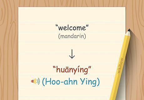 Chinese (Mandarin) - 欢迎 [simplified], 歡迎 [traditional]. Written phonetically like this, "huānyíng," you want to say the second half just a little louder than the first. "Hoo-ahn Ying"