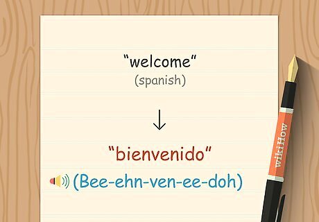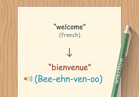 French - Bienvenue. Simple and easy, it literally means "good to see you." When saying the final "U" sound, try to pucker your lips a bit. To learn how, say an "EEEE" sound, then move your lips into a U shape. This "e-ooo" is the French U. "Bee-ehn-ven-oo.