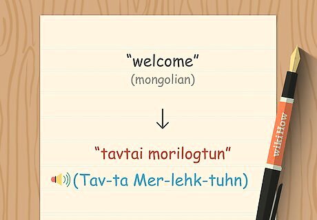 Mongolian - Тавтай морилогтун (tavtai morilogtun). Another tricky one, it is pretty guttural, especially at the end of the second word. Try to use a thick, breathy voice. The first word sounds a bit like "tafta." "Tav-ta Mer-lehk-tuhn."