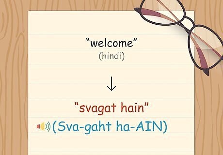Hindi - स्वागत (Svagat) सवागत हैं (svagat hain). Both of these will work, although the second is a little more formal. "Sva-gaht" "Sva-gaht ha-AIN"