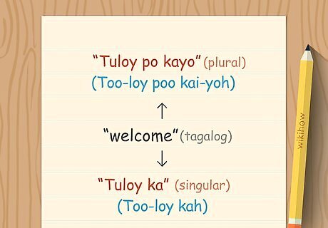 Tagalog - Tuloy ka (singular), or Tuloy po kayo (plural). The first simply means "enter," and is used for one person or a casual acquaintance. The second is for groups or elderly people. Too-loy kah Too-loy poo kai-yoh