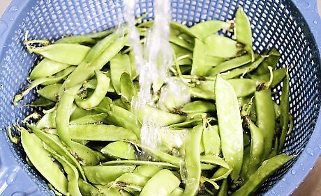 Purchase snow peas that have a fresh, green top. The green should be bright and the seeds very small and flat.