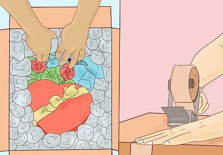 Package everything up. After you have everything assembled in the box, fill any open space with a little newspaper to help things stay in place. This is particularly important for fragile items that may break in transit. Then close the lid or flaps and cover the seams with packing tape. Make sure that you tape it tight and that the box flaps everything is firmly fastened shut.
