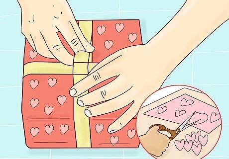 Decorate the box. Instead of sending a drab brown box, put some Valentine’s Day decorations on the outside. Cut out some hearts from red construction paper and glue or tape them to the exterior. You might also wrap the package in red paper and glue Valentine’s cards to the outside. Get creative and add some Valentine’s flair to your package.
