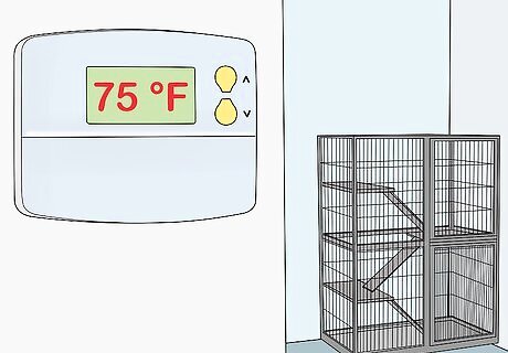 Make sure the location remains between 50 and 75 °F (10 and 24 °C). Ferrets are sensitive to temperatures that are too hot or cold, so maintain a consistent temperature range in the cage location. Most spots in an average home should suffice, but provide supplemental cooling or heat if necessary. Do not, for instance, keep the ferret cage in a basement or garage where the temperature might go above or below the recommended range. The ferret could become ill or even die.