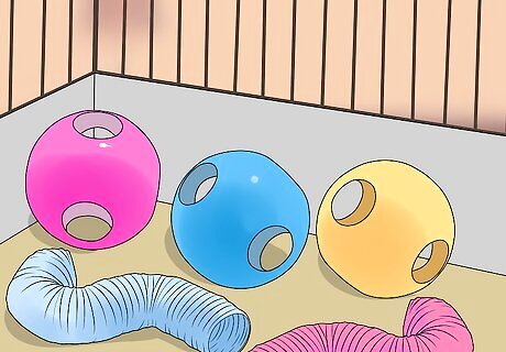 Add lots of hard plastic toys to keep the ferret occupied. Buy hard plastic balls, tubes, and other sturdy toys designed for ferrets. Avoid toys that are made of fabric or thin plastic, since a ferret can easily chew these apart and create a potential choking hazard. Even if you buy sturdy plastic toys, check them regularly and replace them if they are damaged. It may be a good idea to replace toys from time to time anyway, in order to keep your ferret interested. Try using a shoebox with a ferret-sized hole for a cheap alternative to plastic tunnels. Stocking the cage with toys is not a replacement for spending time with your ferret. You should spend 2 hours, at minimum, of every day being actively engaged with your ferret.