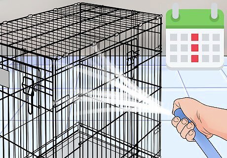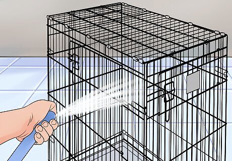 Do a deep-cleaning of the cage at least once a month. You’ll need to house the ferret somewhere else for at least 24 hours during this deep-cleaning. Keep them in a ferret-proof room as much as possible, and put them in a ferret-approved carrier or alternate cage otherwise. Empty out the cage and do a typical weekly cleaning for removable items. Disassemble the cage so you can get into every crevice. Scrub down every surface of the cage with a bleach-based cleanser, or mix your own solution of 1 part bleach to 32 parts water. Take the cage parts outside, if possible, and spray them down with a hose or, better yet, a power washer. If this isn’t possible, rinse them very thoroughly in your tub. Let the cage dry for 24 hours before reassembling it.