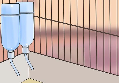 Attach multiple water bottles to the cage bars. A ferret requires a constant supply of fresh water, and they can drink quite a lot when they’re running around. By using 2 bottles, you’ll reduce the chances of them running out of water. Buy bottles that are designed for ferrets and that latch securely to the cage bars. Place the bottles in different spots on different levels—one near the food dish, for instance, and the other on a separate level. Plan to check the bottles regularly and refill them as needed.