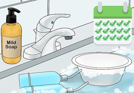 Do a quick cleanup of the cage and accessories every day. Ferrets require a clean environment for their health and safety. Take a few minutes every day to do some basic cleaning of their habitat. Wash the food dish with mild soap and clean water, and scrub out the water bottles with a bottle brush. Scoop out any deposits in the litter, and change the litter if it’s smelly or getting low. Wipe down the flooring (on all levels) with mild disinfecting wipes. Also wipe up any spills or urine/feces outside the cage.