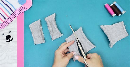 Cut the toe end in, at a left leaning angle. This will leave you with two pieces to form the dog's ears. Put to one side.