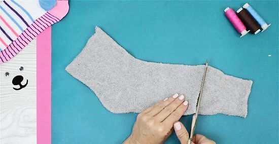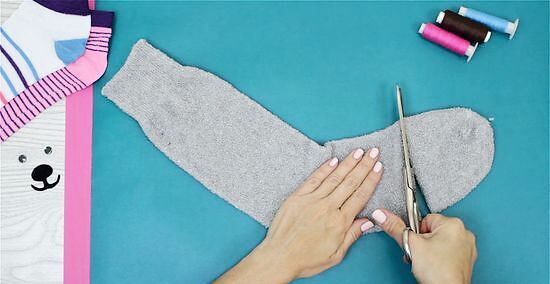 Lay the sock down on a suitable work surface. Cut off the toe end.