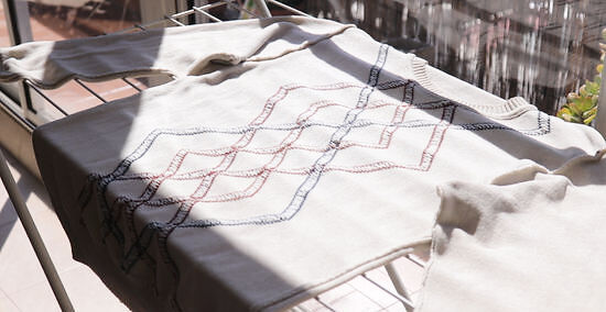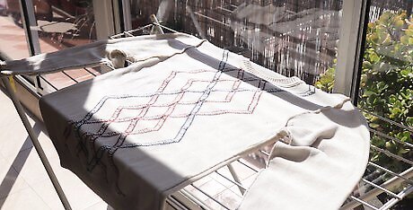 Lay the jumper on a drying rack and shape the areas you want to shrink. Use your hands to arrange the jumper into its proper shape. For example, if the sleeves are stretched out, push the fabric up to the right length, making sure it lies flat on the rack. Never hang a wet jumper on a clothesline or hanger. The weight of the material will pull it down and cause it to lose its shape. If you don’t have a drying rack, lay your jumper on a towel on a flat surface, like the top of your washing machine.