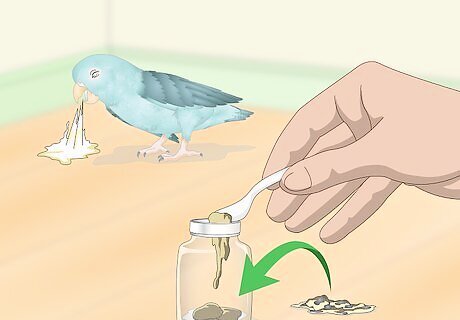 Take fecal samples if they are vomiting or regurgitating food. Vomiting can be dangerous for parrotlets. Your vet may need to test their feces to see if they have a digestive problem. Scrape some of their droppings into a plastic bag, and take them with you to the vet so that the vet can test them. Wear gloves and a surgical mask when taking these samples to avoid picking up an infection yourself. Always wash your hands after handling bird feces. Label the bag with your name, the bird's name, and the date you collected the sample. This will help your vet process the sample. Some possible conditions that may be causing it include candidiasis or avian gastric yeast.
