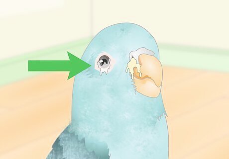 Look for any discharge. Discharge around the nares (the nostrils on the beak), eyes, or mouth can be a sign of many different conditions. This discharge may be a clear film or have a distinct coloration, such as white or yellow. Watery clear discharge from the nares may be normal, but watery eyes are not.