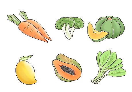 Feed your bird plenty of fruits and veggies. Treating and preventing vitamin A deficiency depends largely on feeding your parrot fresh fruits and vegetables every day, especially those that have a high vitamin A content in the proper amounts. Typically, seed/pellet food should make up about 75% of your bird’s daily diet, while the remainder is comprised of fruits, vegetables, and nuts. Fruits and vegetables that are particularly high in vitamin A content include carrots, broccoli, apricots, mango, papaya, nectarines, peaches, sweet potatoes, yellow squash, cantaloupe, spinach, red chili peppers, and turnip greens. Some fruits and vegetables that are particularly low in vitamin A content include apples, corn, bananas, lettuce, grapes, oranges, white potatoes, and summer squash.